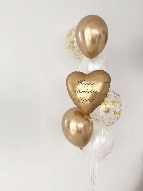 Deze tros bestaat uit  6 latex ballonnen Metallic/pearl en confetti en 1 folie hart.  (behandeld met hi-float voor een langere zweefduur).